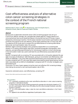 Barré, S., H. Leleu, R. Benamouzig, J. C. Saurin, A. Vimont, S. Taleb, and F. De Bels. 2020. ‘Cost-effectiveness analysis of alternative colon cancer screening strategies in the context of the French national screening program’, Therap Adv Gastroenterol, 13: 1756284820953364.